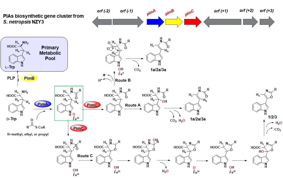 吲哚噁唑环存在于多种天然产物及其化学衍生物的结构中,含有该药效团的化合物普遍显示出优异的生物学和药学活性,如抗肿瘤、抗肠道病毒、抗血栓形成、抗癫痫、抗植物病毒、抗植物致病真菌、抗农业害虫、除草等,在疾病治疗和农业保护等领域均具有重要的应用价值。作为一类广泛被重视和关注的药效团,虽然噁唑啉环或噁唑环在天然产物中的多样化生物合成方式被广泛报道,然而除了假单胞菌来源的labradorins(Angew. Chem. Int. Ed.,2021)以外,大多数吲哚噁唑类化合物的生物合成方式仍然尚未阐明,很大限制了人们对吲哚噁唑生物合成方式的科学认知,并成为该类化合物走向绿色规模化应用的一个关键瓶颈问题。Pimprinines类化合物是链霉菌代谢产生的一类结构多样并且生物活性显著的吲哚噁唑生物碱,然而其生物合成机制一直悬而未决。该团队通过同位素标记、生物信息学分析、基因组挖掘、基因簇异源表达、基因敲除与回补以及前体的体内生物转化与定量检测等多种策略,成功定位到链霉菌NZY3中pimprinines生物合成基因簇。通过蛋白表达纯化、酶功能的生物化学表征、产物有机结构波谱解析、体外一锅法等多种策略,阐明了PimB是一种新型的PLP依赖的色氨酸消旋酶催化D-色氨酸的形成,扮演了合成途径“守门人”的角色,PimA是一种特殊的D-色氨酸-N-酰基转移酶,而PimC是目前唯一一种催化N-酰基-D-色氨酸产生吲哚噁唑药效团的α-酮戊二酸/FeII依赖的双加氧酶,揭示出一条前所未见的D-构型底物顺次导向的精准分子装配线。与假单胞菌不同,这种以D型氨基酸作为途径开关的方式体现了链霉菌次级代谢调控的复杂性和精密性。进一步,通过PimC关键残基的点突变与生化表征、同位素标记与质谱追踪等技术手段,该研究证实吲哚噁唑环的形成采用一种自由基重排与环缩合的方式发生,同时伴随着脱水和脱羧基反应。此外,PimC还可以通过经典的“羟基回弹”机制或“β正离子”机制,产生含有反式双键的代谢副产物,显示出催化功能的多样化。鉴于pimprinines重要的医用和农用价值,该研究不仅为吲哚噁唑类天然产物的生物合成机制研究提供新的科学理论见解,也为进一步深入开展该类高附加值生物碱的合成生物学研究提供了新颖的酶工具元件,为实现pimprinines及其类似物的大规模生产奠定了坚实的理论和物质基础。